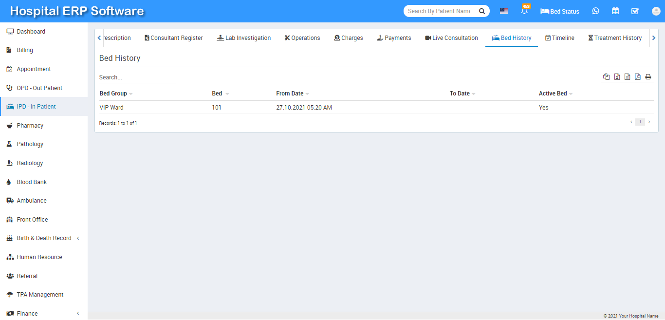In IPD –In Patient you will find Bed History tab, The Bed History shows the assignment of beds to the patient under different categories like Bed history when patient was admitted at ICU.