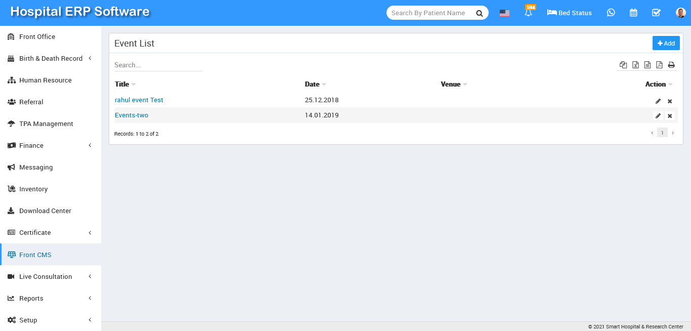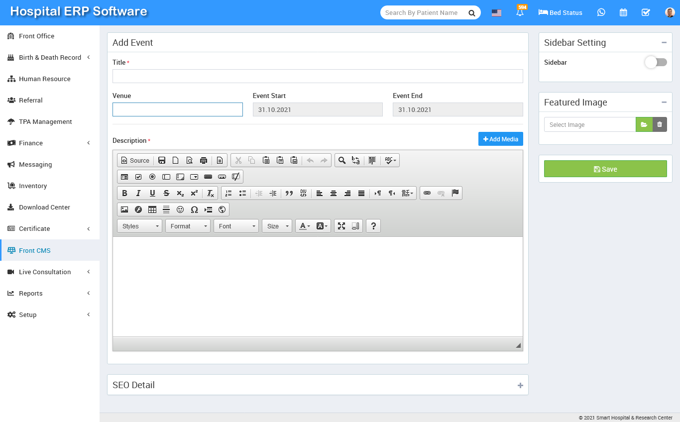 To add event, go to Front CMS then click Down Arrow icon and then click on Add Event button present at top right corner in Page List page. Here you can add all events scheduled past/future in your hospital. To add new event click on + Add button. Here enter Event Title, Event Venue, Event Start Date, Event End Date, Description, SEO Detail Meta Title, Meta Keyword, Meta Description then select Sidebar Setting, Featured Image then click on Save button.