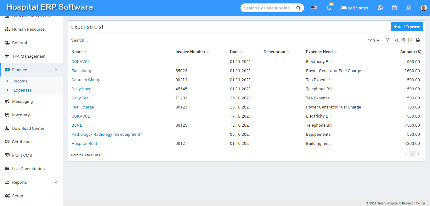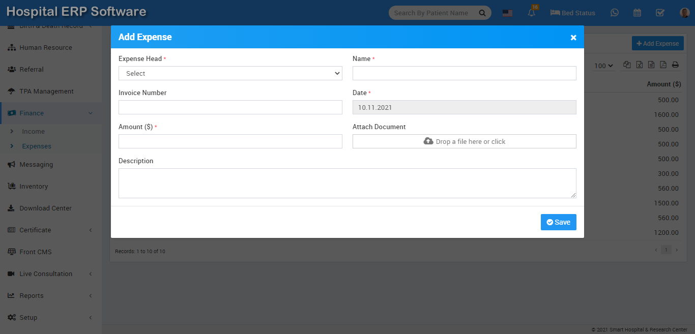 Here we can manage all expenses coming from different Expense Heads. To add new expense click on + Add Expense button here enter Expense Head, Name, Invoice Number, Date, Amount, Attach Document and Description then click on Save button.