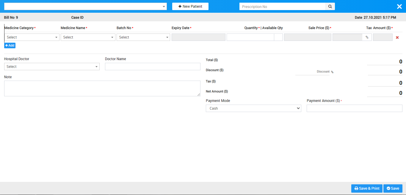 So for manually generate medicine sales bill click on Generate Bill button at pharmacy bill page, here first select patient or add new patient to generate patient pharmacy Bill from +New Patient button here bill no will be auto generated Number so you need to add Medicine Category, Medicine Name, Batch Number, Quantity, Sale Price, Tax Amount. To add more medicine click on "+Add" button, then add Hospital Doctor, Doctor Name, Note, custom field details (if any) then after adding all medicine enter Discount and Tax if any, to calculate final bill click on Calculate button then click on Save button. After this bill will be display on pharmacy bill page. To see bill details click on Show button now here you can also Print medicine bill.