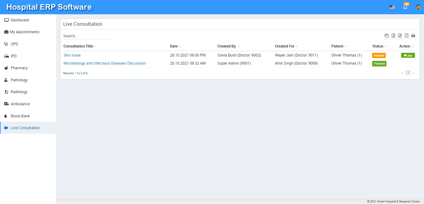 Here all the Live Consultation like from Appointment, OPD and IPD modules for patients will be listed.