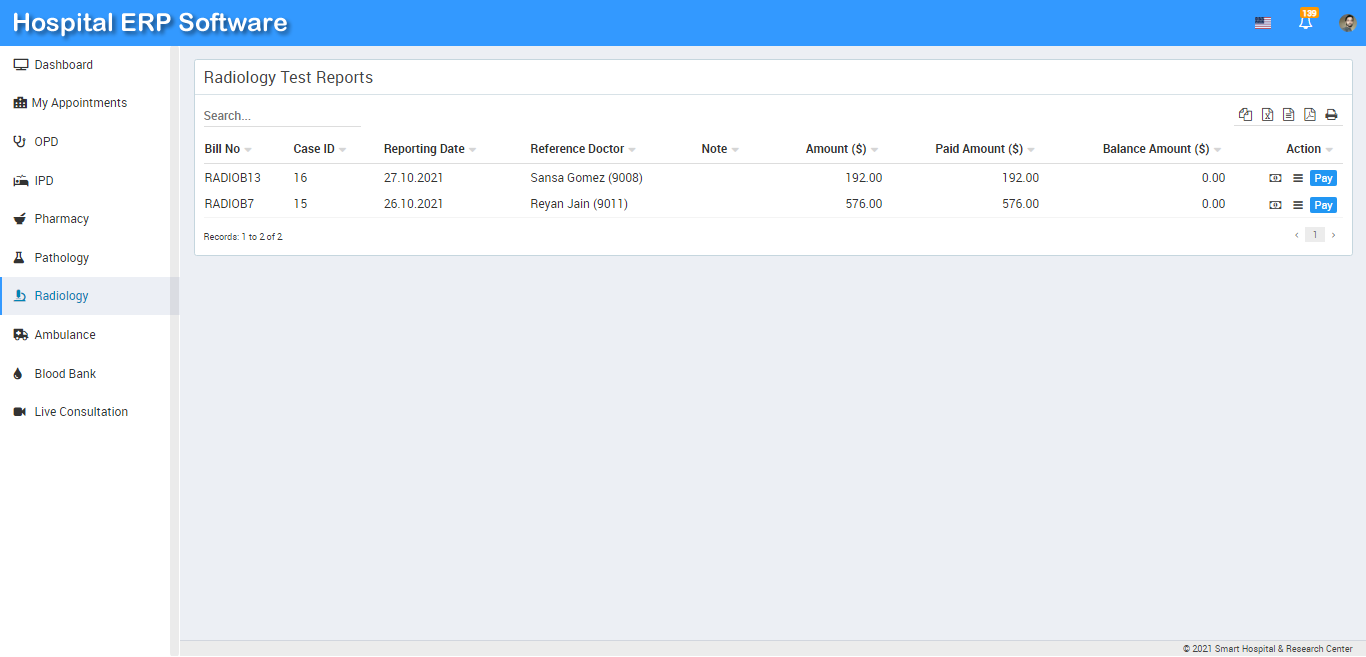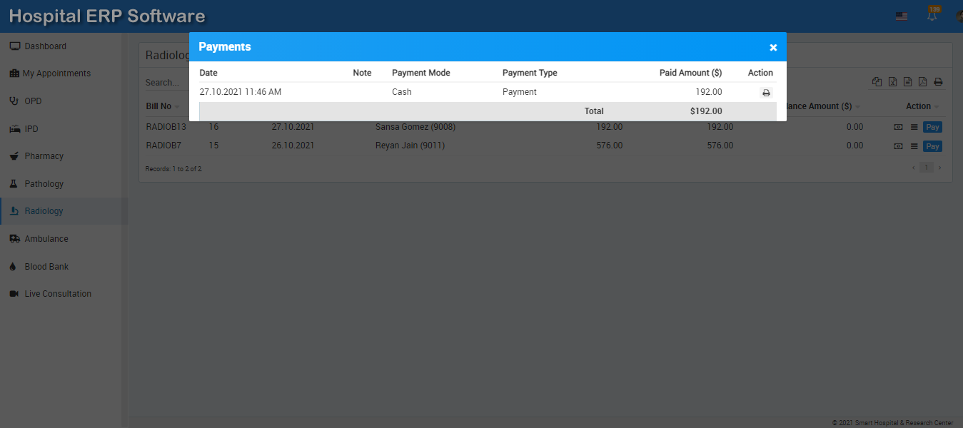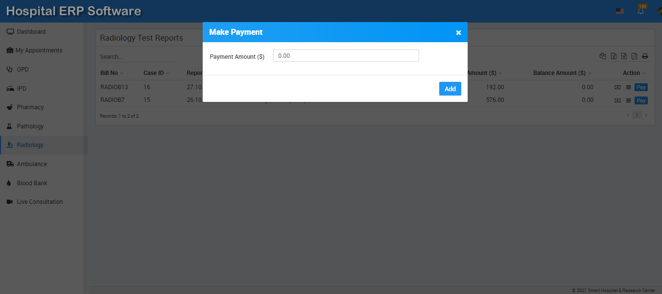 To make online payment for Radiology click on Pay button here you can edit payment and click on add button, this will redirect you to payment gateway from where you can make online payment for Radiology.