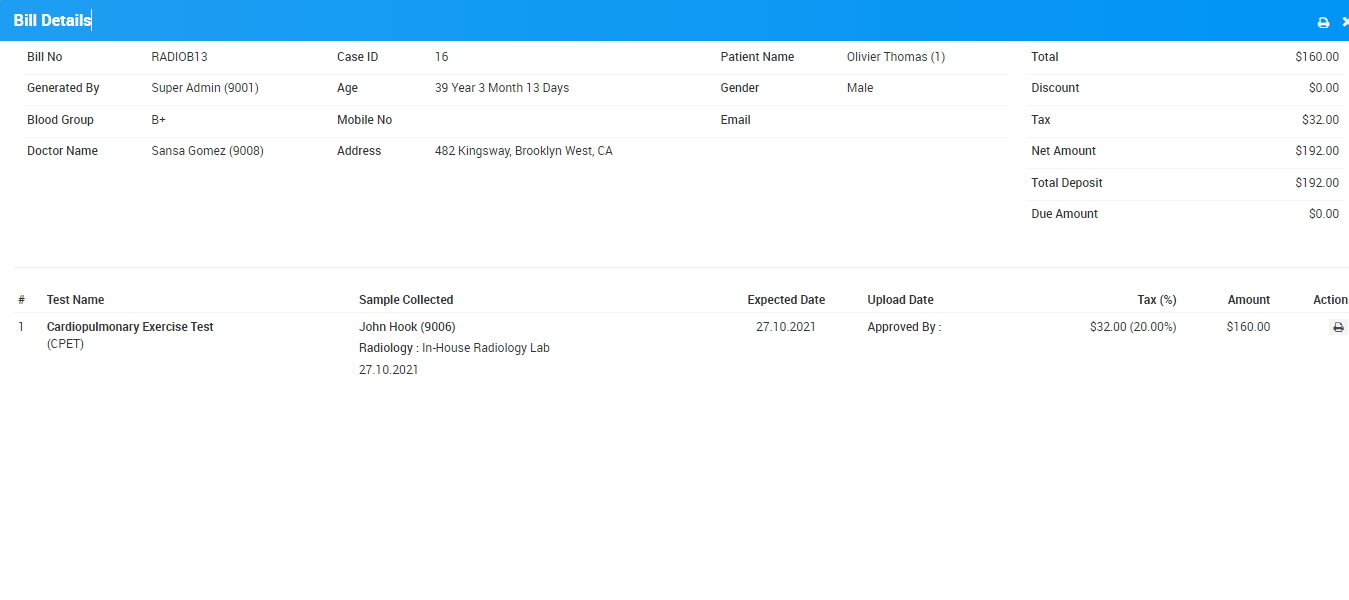 To view Radiology report bill details click on Show button present at Action column. To print bill click on print button present at top right side on the header.