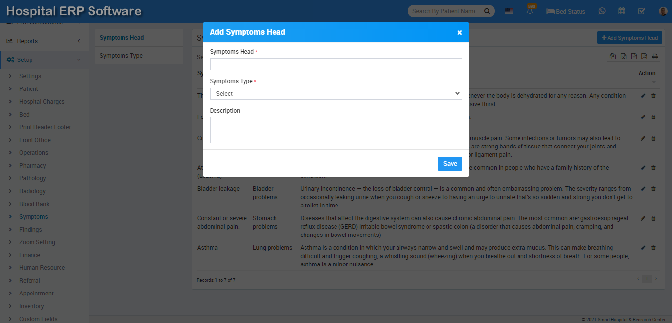 To add Symptoms Head click on + Add Symptoms Head button now enter Symptoms Head Symptoms Type, Description and click on Save button.
