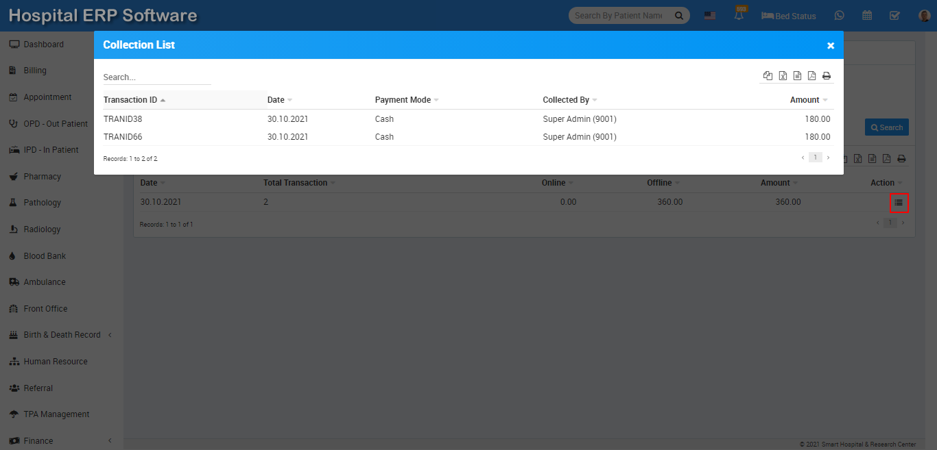 To view each Daily Transaction individually click on View Collection button present at Action column. Here you can see Daily Transaction details Like Transaction ID, Date, Payment Mode, Collected By of individual transaction.