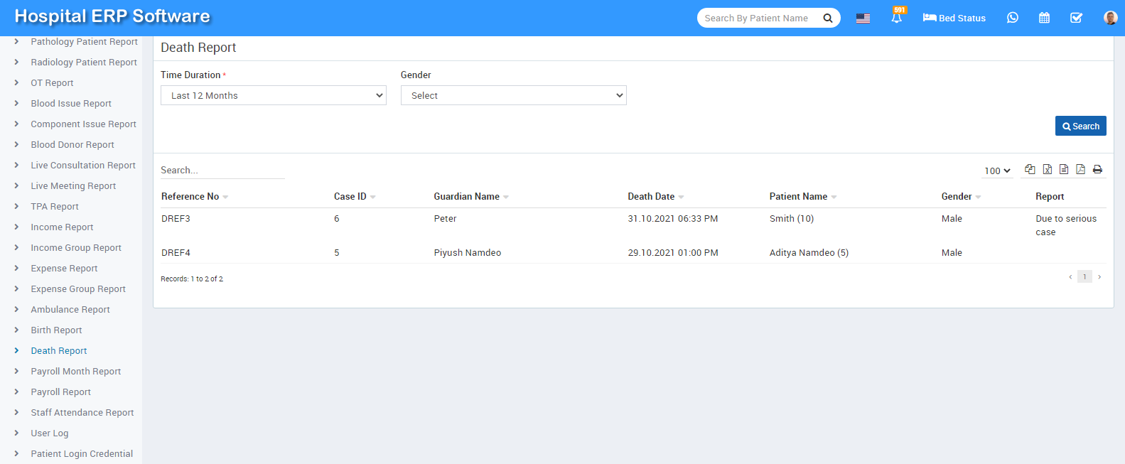 To check Death report, go to Reports > Death Report. Here select the Time Duration and Gender then click on Search button. Here you can see Death details like Reference Number, Case Id, Guardian Name, Patient Name, Gender, Death Date, Report etc. Also you can download this report as PDF.