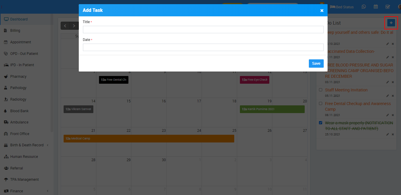 To add to do list, click on the Calendar icon present on the top right corner of the header, it will redirect you in the calendar page, here click on Add icon present at the right side of the page, then enter Title, Date and then click on Save button. Once record is added you can see it in the To Do List.