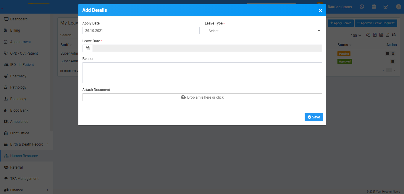 To apply leave, go to Human Resource > Approve Leave Request > Apply Leave then click on the Apply Leave button present at top right corner in leaves page, at click of this button Add Details modal will be open. Here select Apply Date, Available Leave, Leave Date, Reason and Attach Document and then click on Save button.