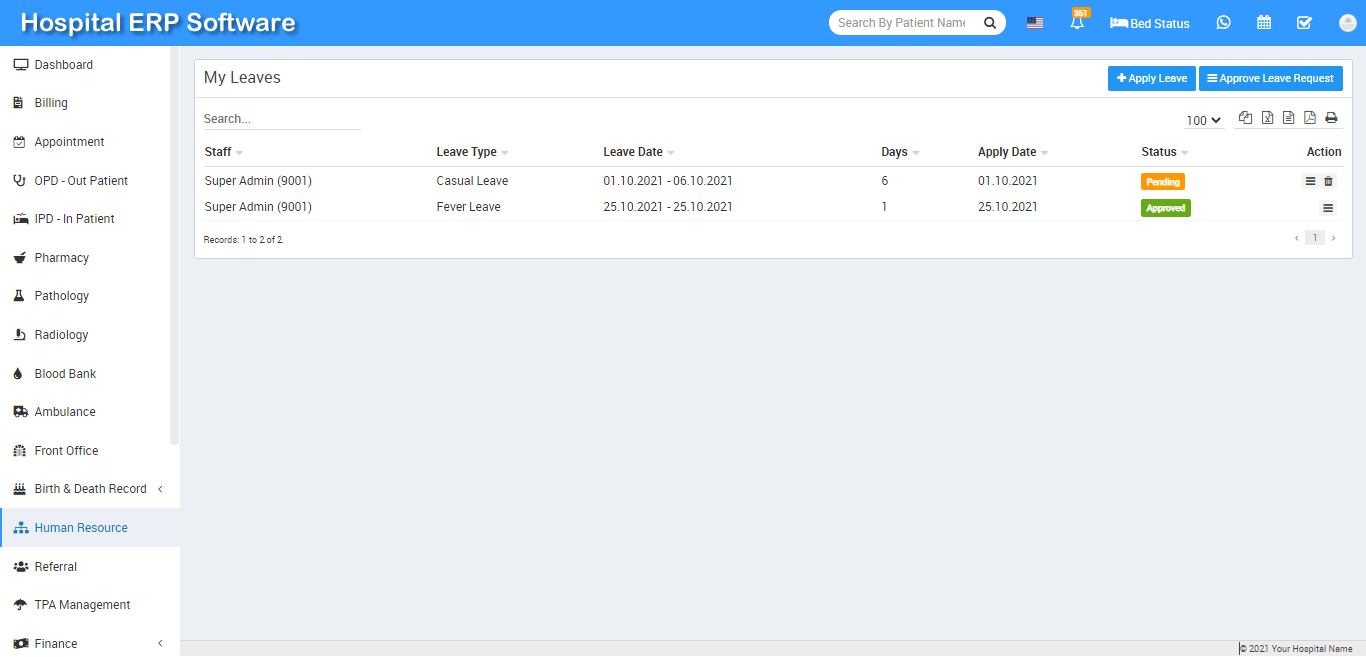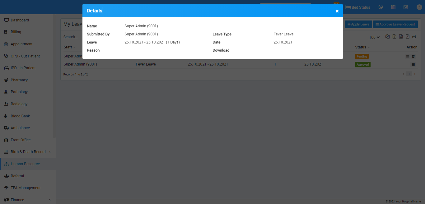 To view apply leave click on View icon present at Action column in the leaves page, at click of this icon Details modal will be open. Here you can see the details of staff member.