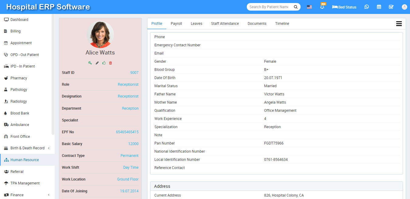 To view staff details click on Show icon present in staff card. Here you can view basic detail of staff like Profile, Payroll, Leaves, Attendance, Documents, Timeline.