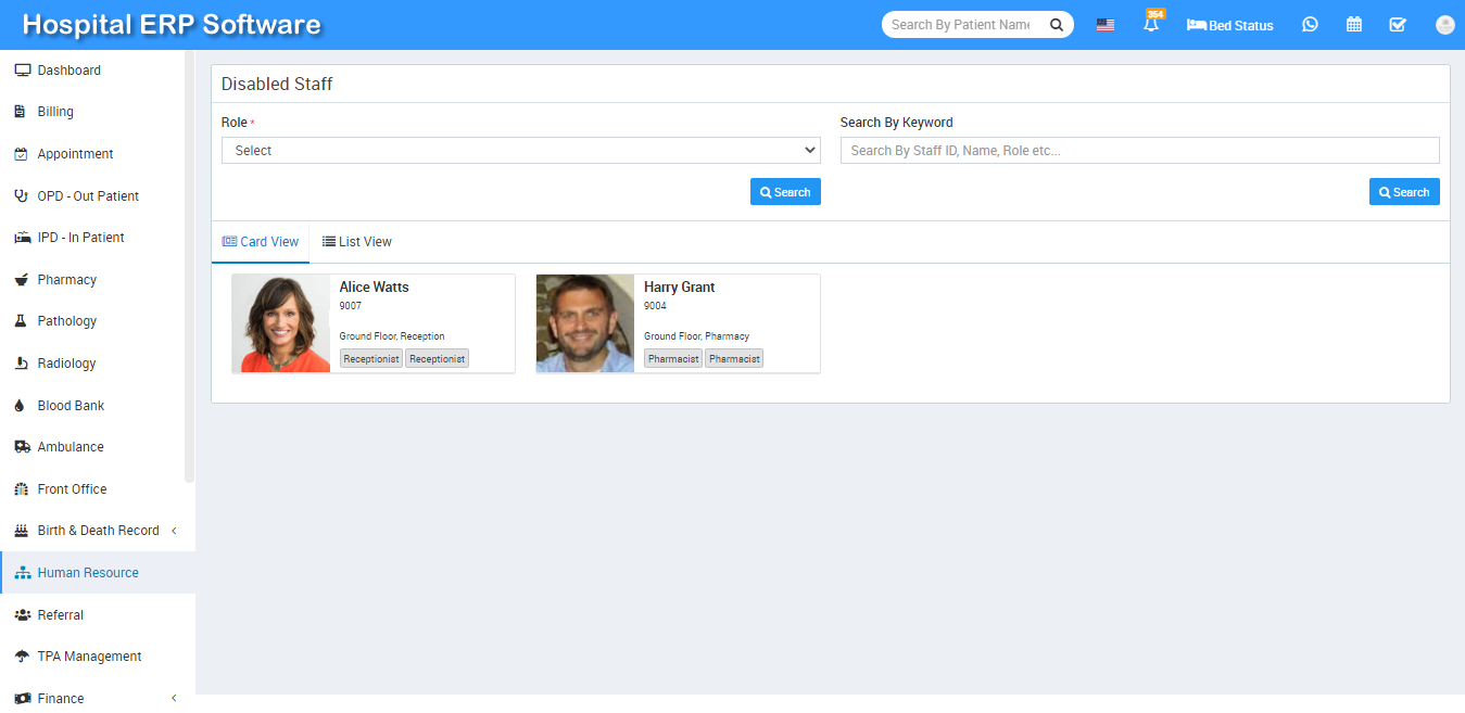 To view disabled staff, go to Human Resource > Add Staff > Disabled Staff then select Role and then click on Search button. You can also search any disabled staff by entering any matching Keyword in the Search By Keyword Text Box and then click on Search button. The list of disabled staff will be shown below of the page.