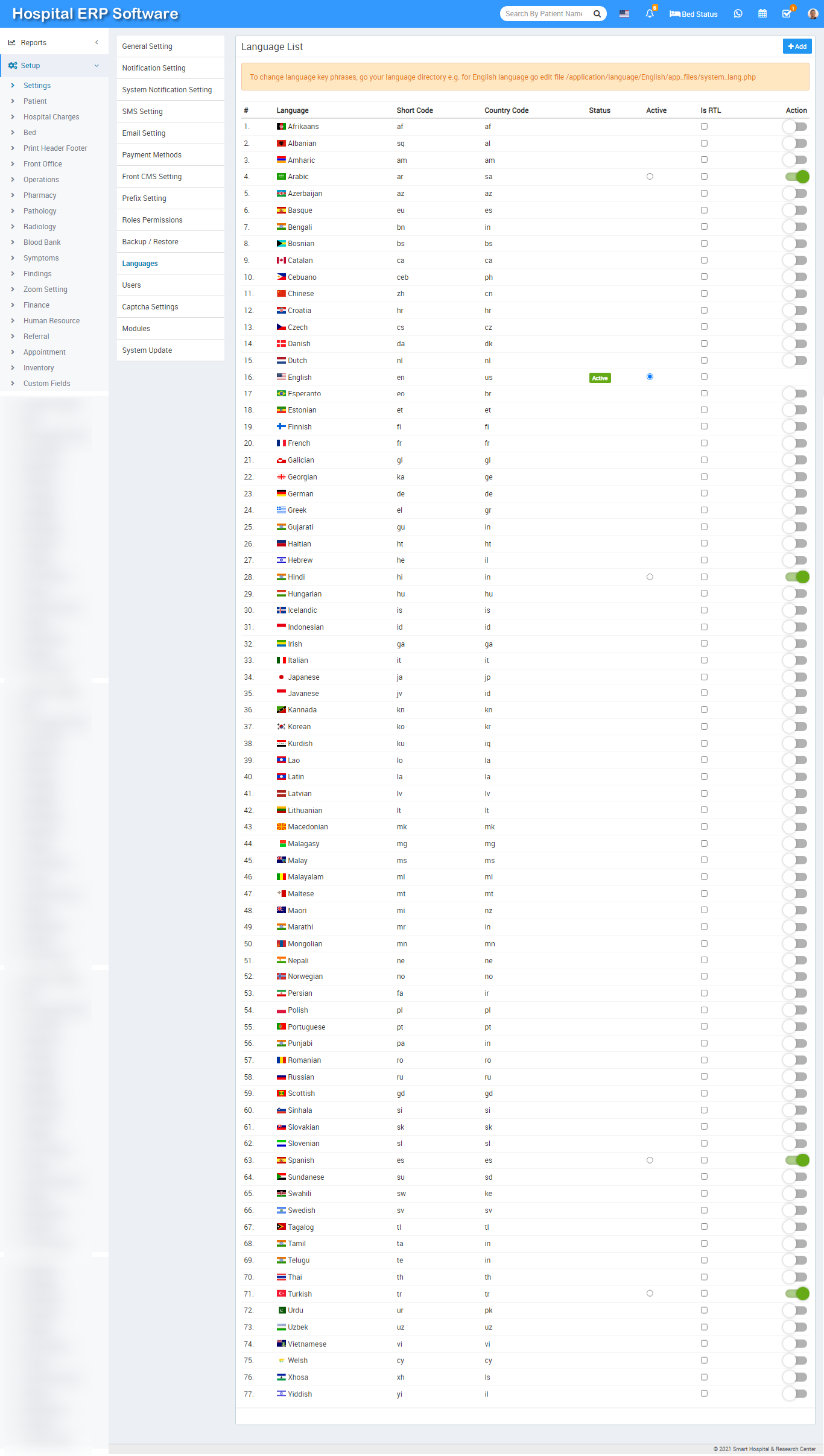 You can enable multiple languages and select your default language. To change language key phrases, go your language directory e.g. for English language go to the file /application/language/English/app_files/system_lang.php . Where as /application/language/English/form_validation_lang.php file is used for validation message text. Here we are providing 76 language in our Hospital ERP Software –