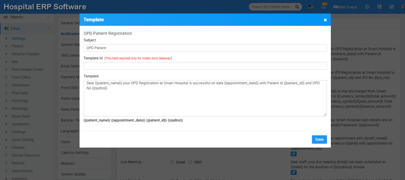 To manage notification setting, go to Setup > Settings > Notification Setting. There are 9 events OPD Patient Registration, IPD Patient Registration, IPD Patient Discharged, Login Credential, Appointment Approved, Live Meeting, Live Consult, OPD Patient Discharged and Forget Password where automated Email / SMS are sending to concerning person's email / mobile number. To control, when email / sms notifications will be send use Notification Setting.